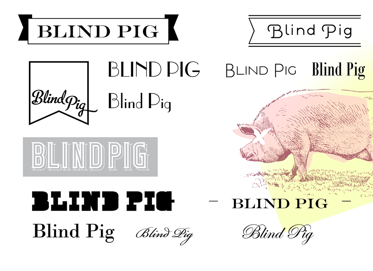 Typographic and illustrative concepts for the 'Blind Pig' Moonshine brand.